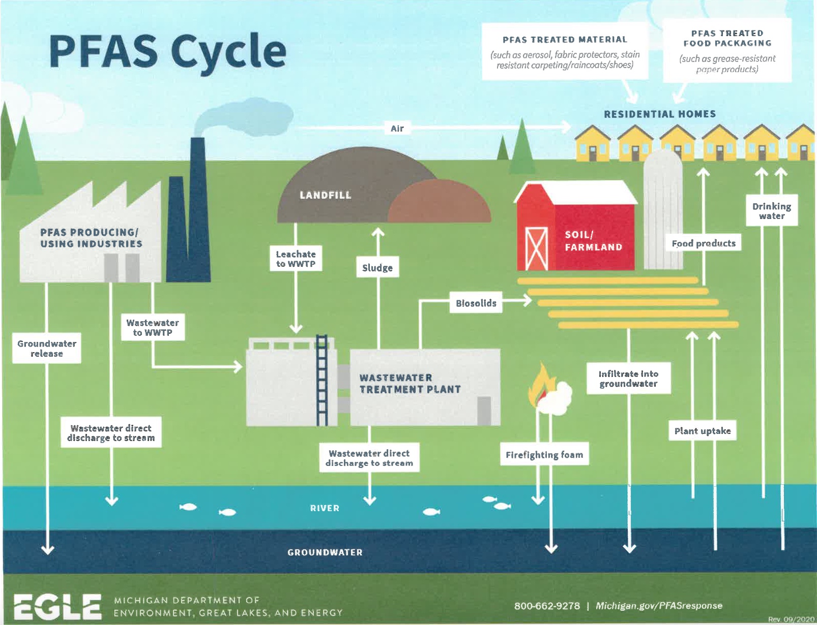 Perfluorooctane Sulfonate, or PFOS for common language, exists in 37 counties in Michigan. A PFOS contamination level has not been exactly determined for the maximum contaminant level (MCL). Most states are regulating around the mark of 14 parts per trillion. That’s about the equivalent of six contaminated water drops in an Olympic size swimming pool!