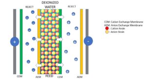 Electrodeionization (EDI) is a form of high purity water treatment technology. It replaces the use of portable mixed bed deionization. EDI uses a small amount of electricity to continuously regenerate the resin. Traditional mixed bed deionization requires exchange by your local service provider. The service provider then has to regenerate that resin using harsh chemicals. EDI is preferred over mixed bed ion exchange in places with high volume purified water usage, and frequent need for traditional mixed bed exchanges. At Flier’s Quality Water, we offer EDI (Electrodeionization) designed to optimize performance and minimize maintenance.